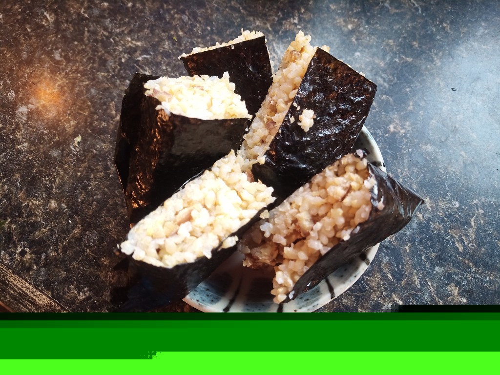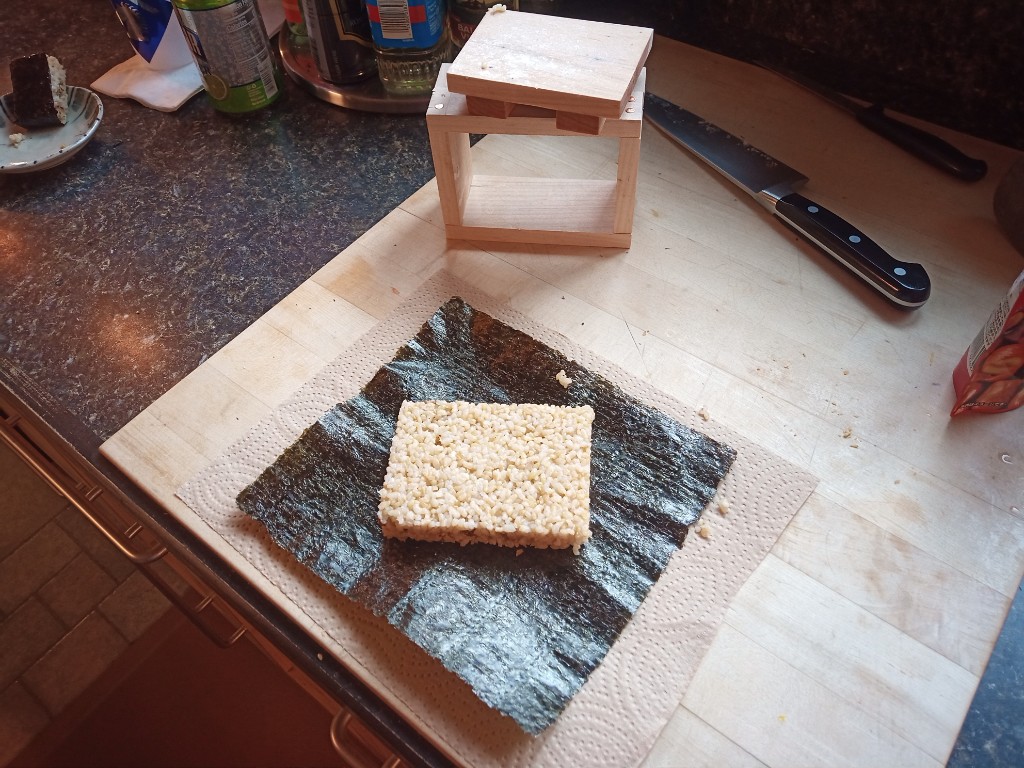 Anyway, in order to make oshizushi of any kind, you need a press. I have a plastic press for making onigiri, but it is not good for making anything other than the triangular rice balls. The best presses are a kind of bottomless box, with a lid that slides inside like a piston. It does not have to be super-solid since you’re only applying finger pressure, but it should be fairly sturdy. The open bottom enables you to place the box (“hako” or “bako“) onto a sheet of nori or other flat surface, fill it with rice and other tasty stuff, then insert the lid and compress the ingredients into shape. You can then lift the box from the surface and use the lid to push the oshizushi out the bottom.