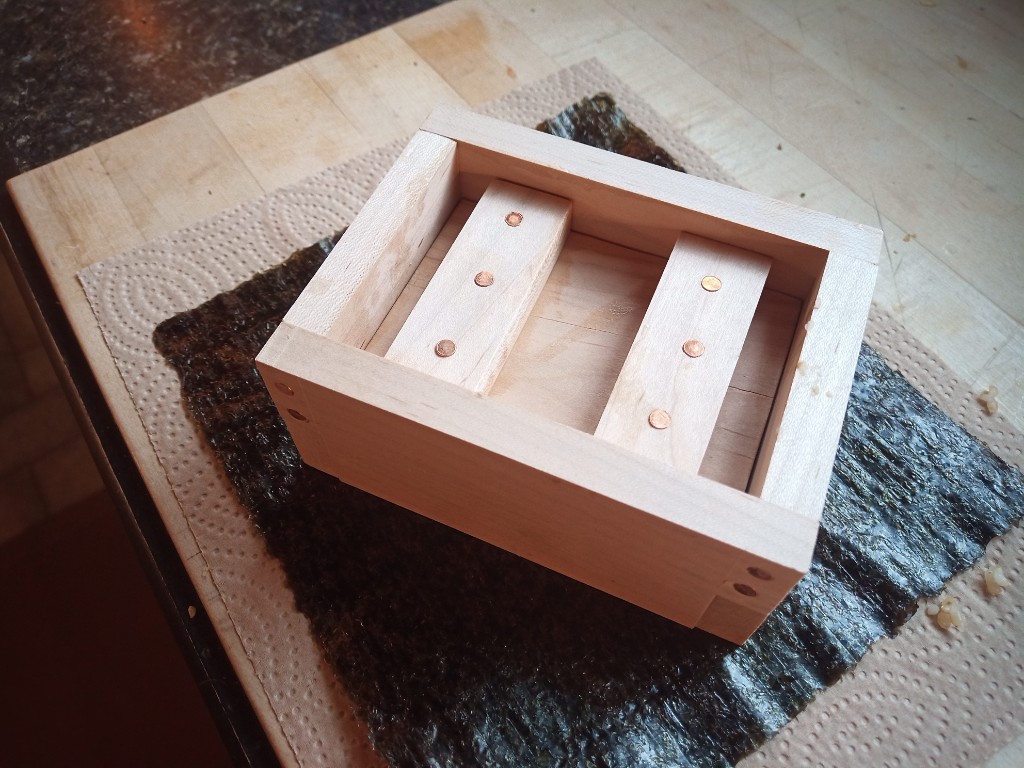 I made my oshizushihako from some maple I bought at the Alben Sawmill and machine-planed down to 5/8″ thickness. The corner joints are the large-fingered box joints that I see on most medieval Japanese boxes, and since I didn’t want my food to contact glue I secured the joints with copper nails. The piston lid is a flat piece of maple that is roughly 3″ x 4.24″ to follow the 1 by 1.414 ratio that is commonly seen in Japanese woodworking. This is also a good size for making onigirazu “rice sandwiches”.
