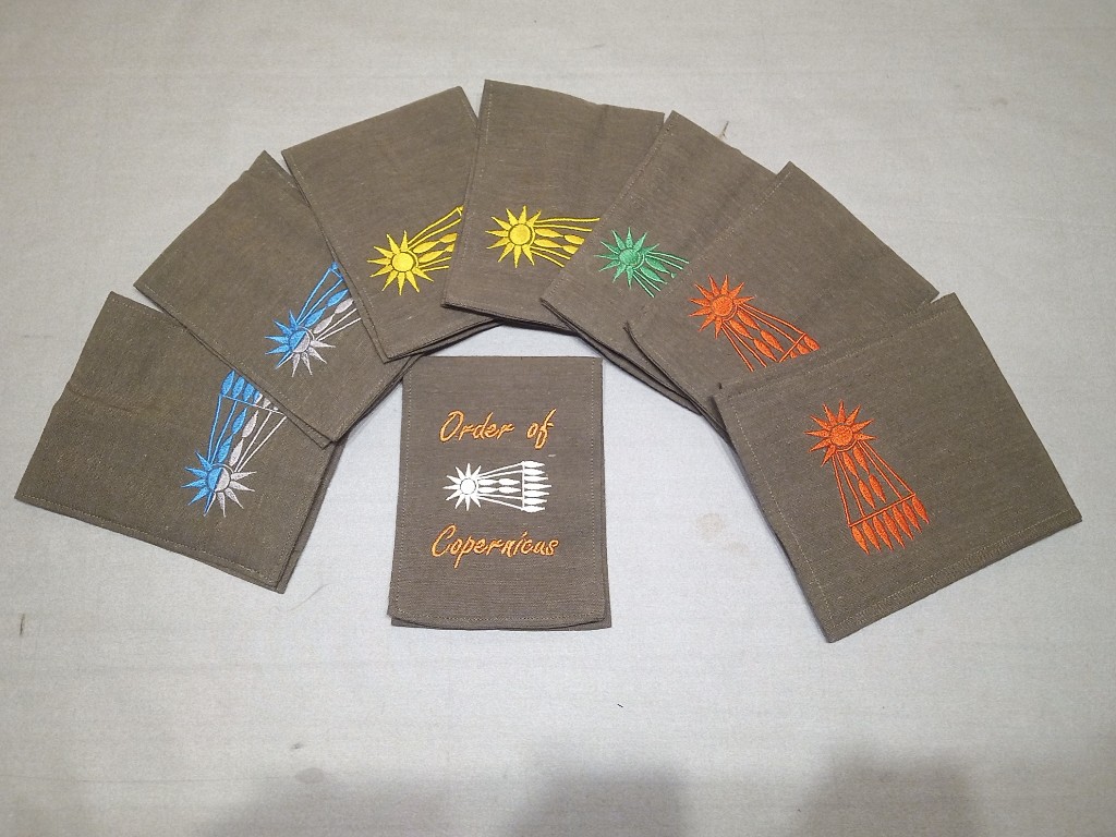 These are all made from surplus fabric green linen from my recent Basic Hakama project. The red comets are for martial activity, gold for service, blue/silver for arts & research, and green for “friend of the Barony”. The comet on the Order of Copernicus favor glows in the dark!