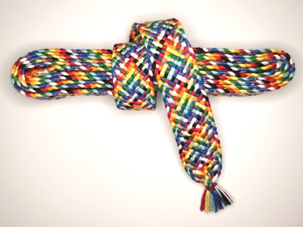 Started with 17 strands of cotton crochet cord in 9 different colors, 4 ends per strand about 116″. Had it on the takadai for about a month, working on it here and there, plain 1-1 interlacing. Finished it up this week while I have more free time. 76″ between the bindings, roughly 7/8″ wide.