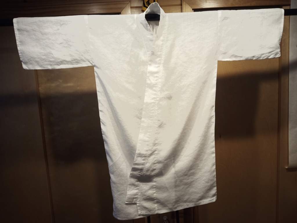 I only had a few months left to make my white kosode for 2025 anyway. This one is from the nice white linen I have been buying at Pennsic for the last few years. Due to some poor planning, I was not able to use the most au courant sewing pattern for kosode. I also decided to cut the piece for the neck band a little wider than normal, so it would stay more visible when worn under other kosode. This meant that the okumi overlaps are a little small. Oh well.